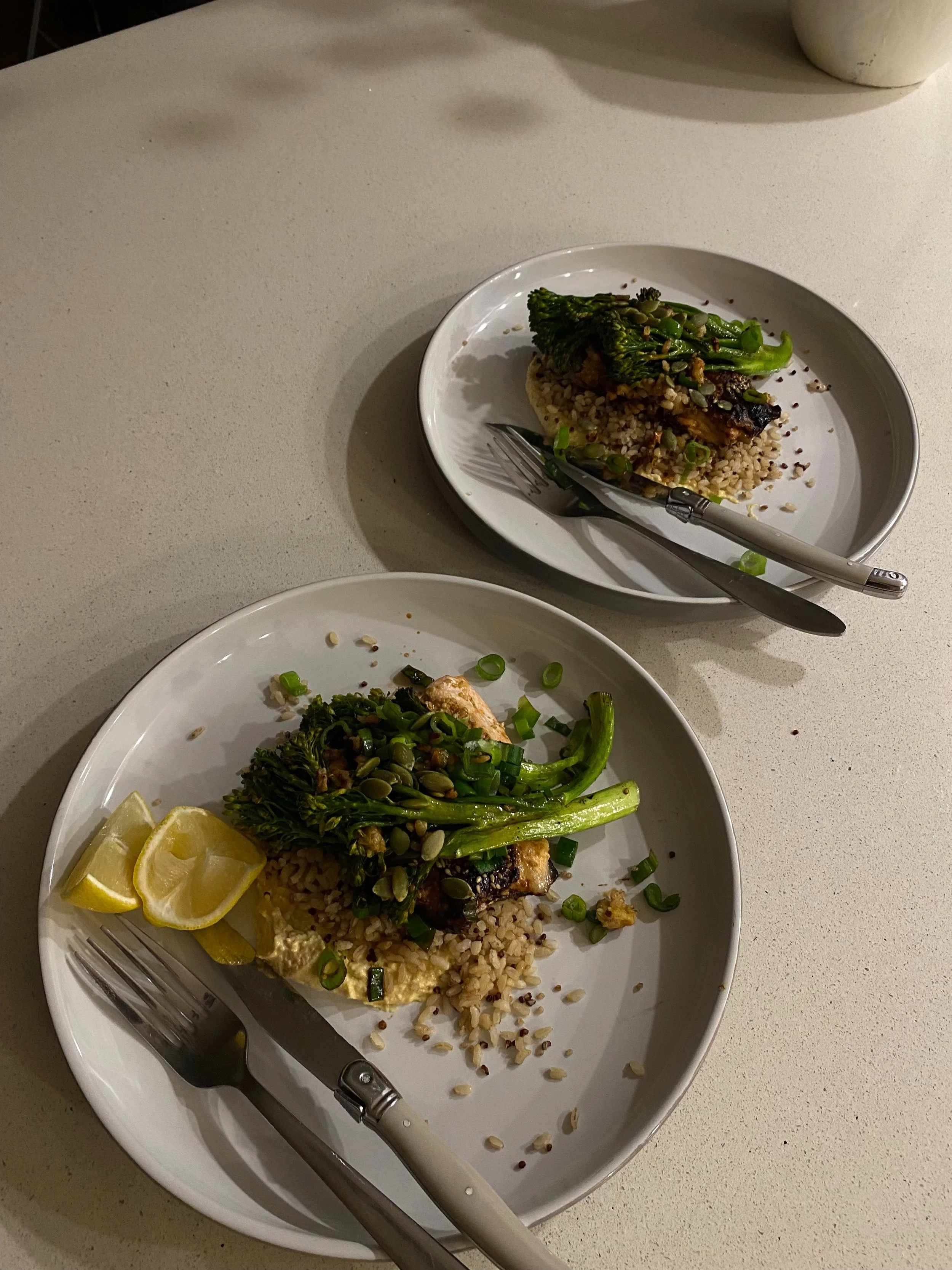 To prepare your dish, spread a dollop of hummus onto your plate, followed by half of the brown rice and quinoa mix. Layer with the salmon, then the broccolini.